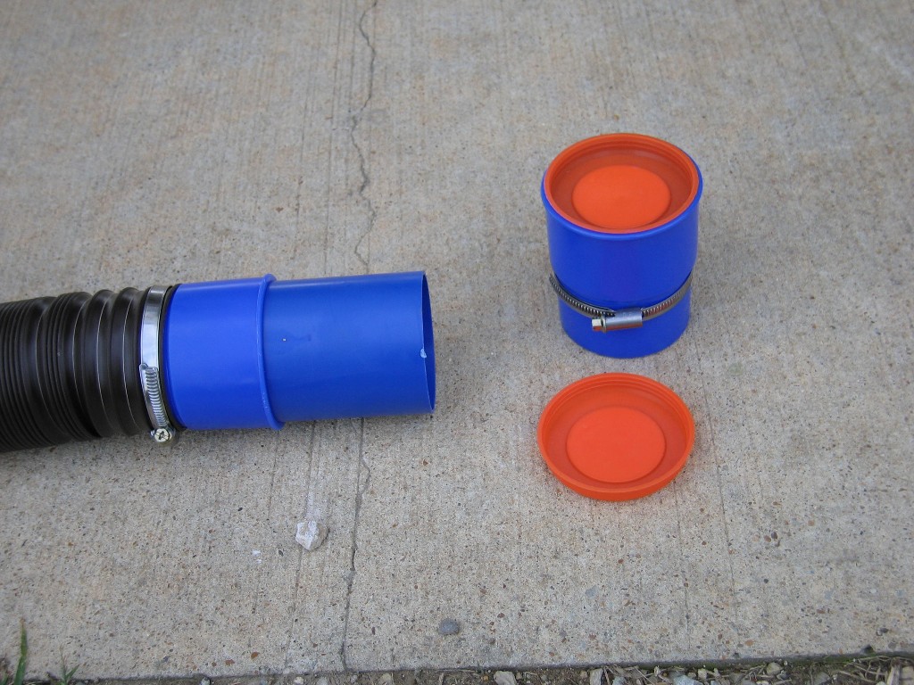 connection of two hoses. You supposedly can screw two Sewer Master hoses together but we did not want to use that method. We also acquired the necessary 90° elbow to connect to the park drain as well as the bayonet end that attaches to the RV. |
