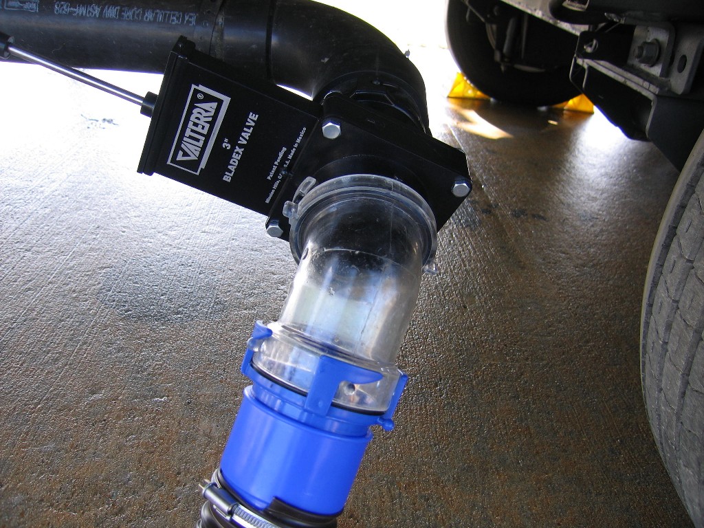 We also carry a macerator pump and 225' of 3/4" hose to be able to dump when a nearby sewer connection is not available. We prefer to use the 3" hose when we can. The "swoosh" of the water rush in the 3" hose pulls a lot of material out of the tank. |