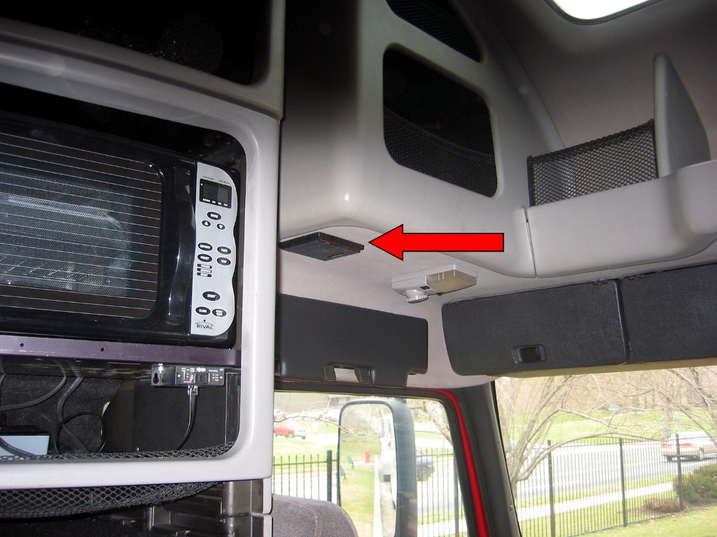 The amplifier will be mounted in the blind space on the right in the cabinets over the windshield (see below). | |