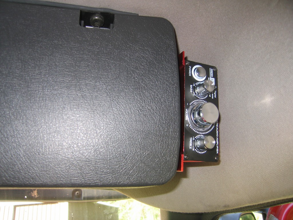 to the shifting of other items in the compartment. Not available when we first setup Red Rover, we found this mini stereo amplifier on eBay that was small enough to mount on the outside end of the overhead compartment. Also, since the mini-amplifier was DC powered, it removed a large AC/DC brick from inside the rather crowed dash. |