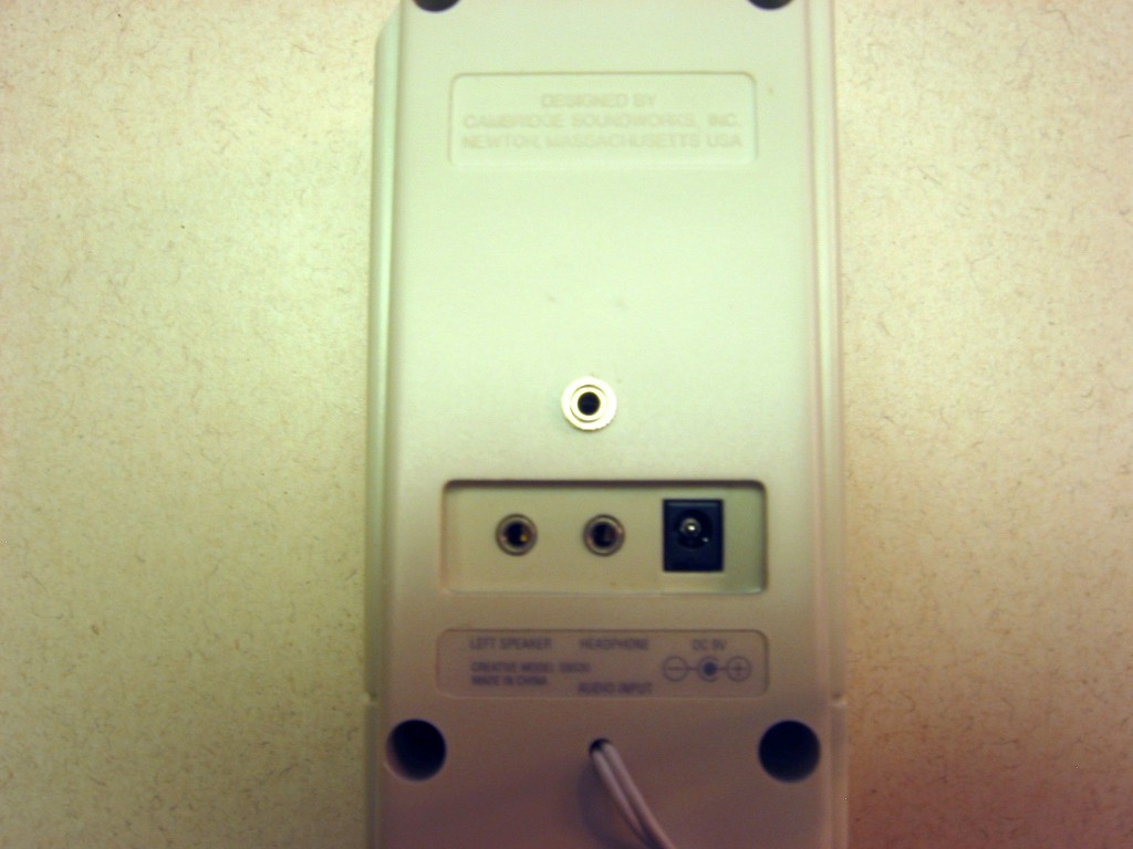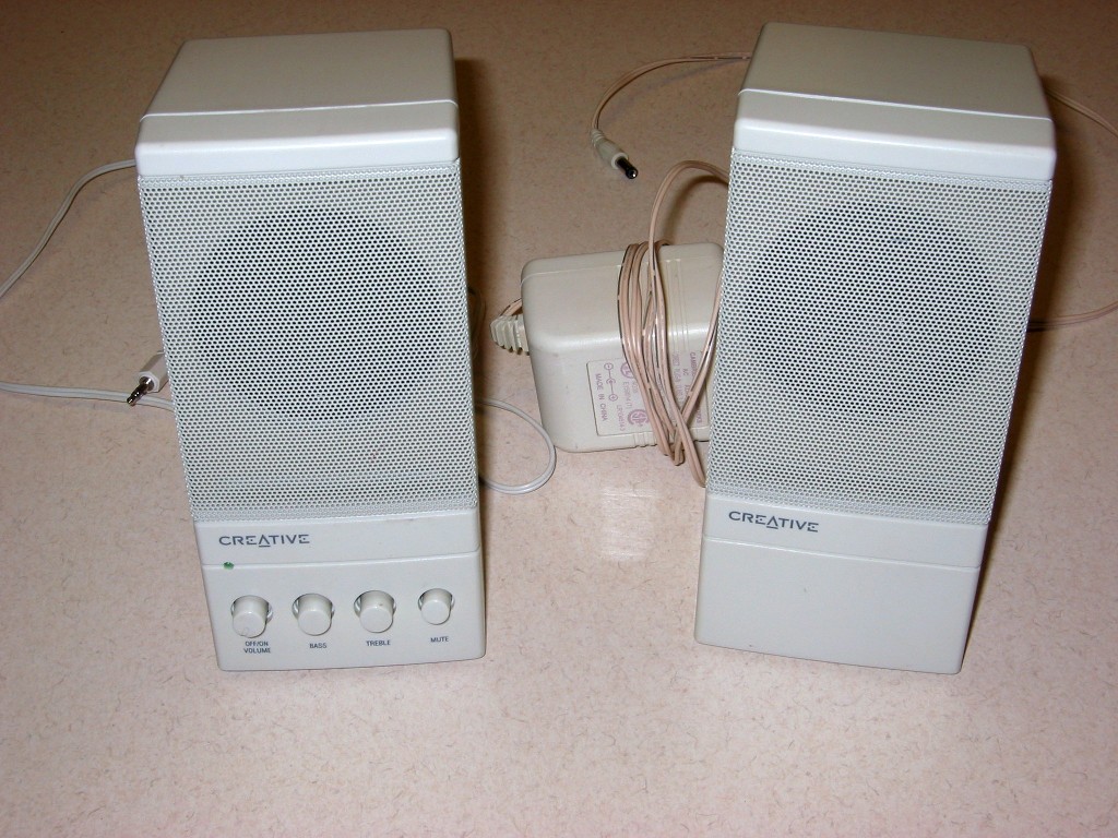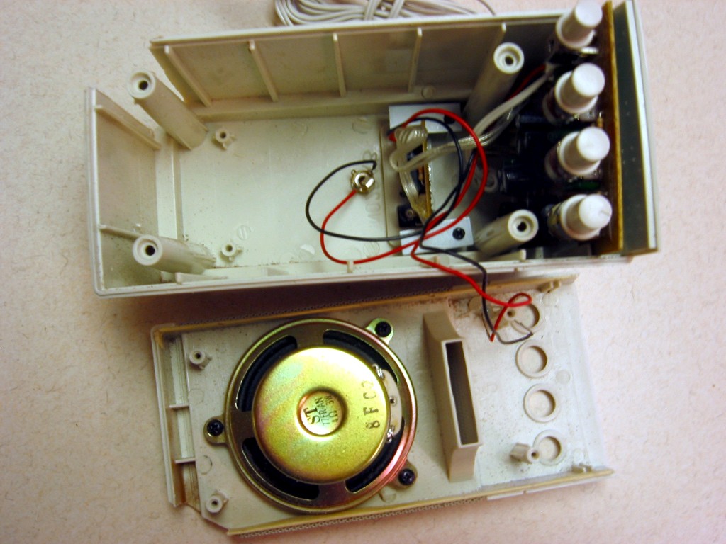 We started with a set of amplified PC speakers. One speaker had the amplifier mounted within it. We modified that one. | |