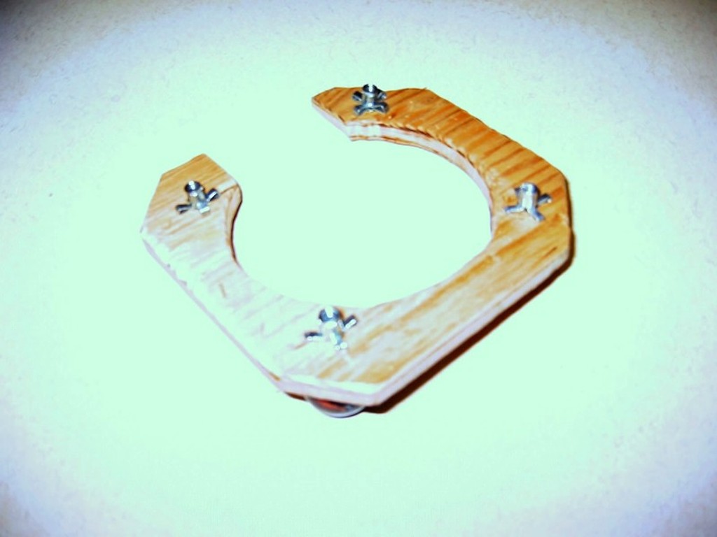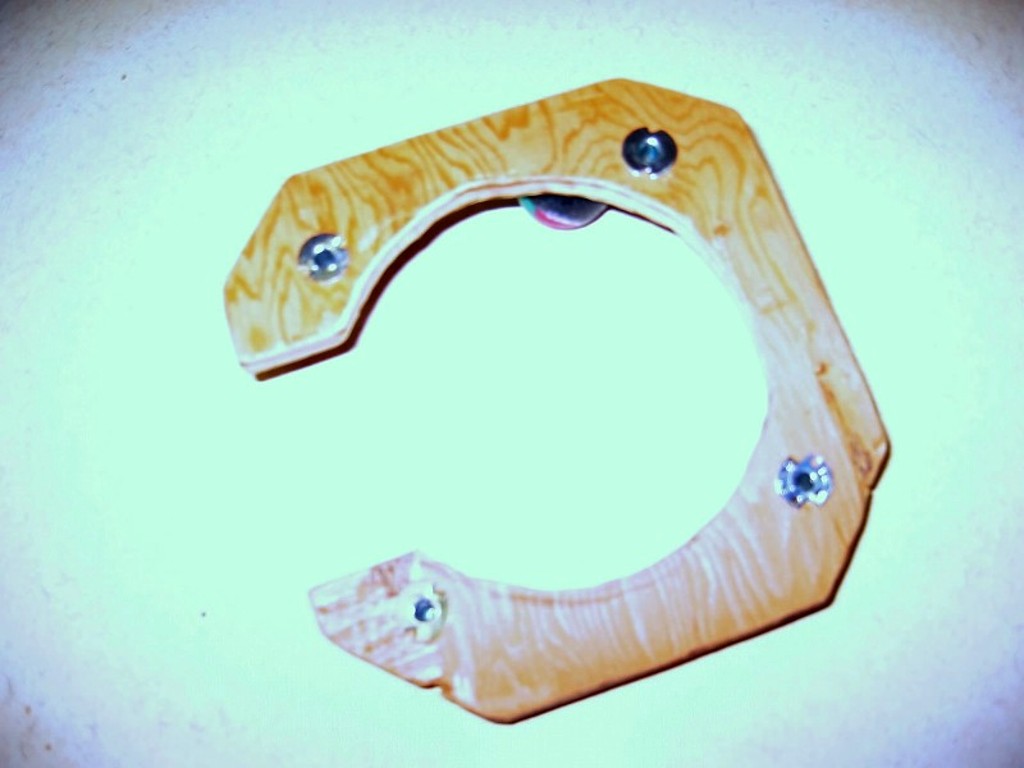 To mount the speaker, my buddy Ron Knight gave me the idea of making these C-brackets. We used quarter-inch plywood and mollies. The notch in the C-Bracket allowed us to insert the bracket into the hole cut in the ceiling liner. The ceiling liner has about a half-inch of sound deadening material that gives a fair amount of strength to the ceiling. The ceiling is trapped between the speakers and the C-brackets. | |