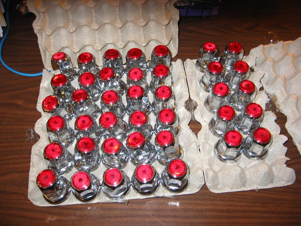 This is Mark's Christmas present from his daughter, Stacy and Son -in-Law, Ken. 40 red reflector lug nut covers. These will add some sparkle to Red Rover's wheels.< | |