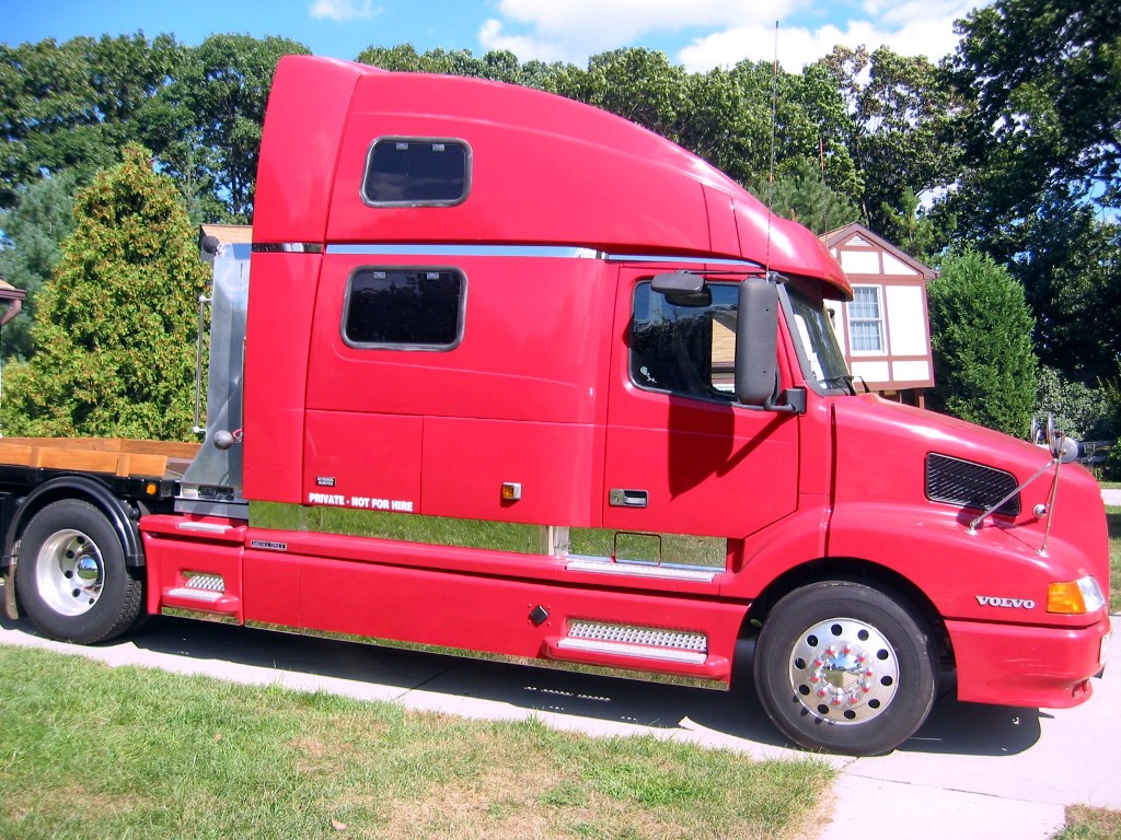 When we saw the upper trim in the Dieters Catalog, we decided that we wanted to add that to Red Rover. We felt that the stainless steel stripe along the crease line from the top of the doors, across the sleeper and the cab fairings, would break up the great redness of Red Rover. | |