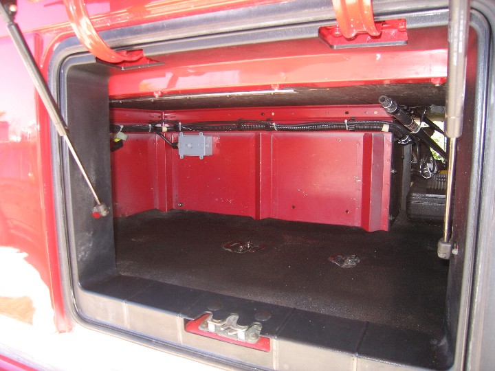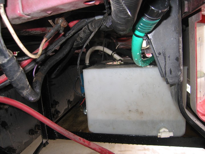 Here is a view of the shelf installed. The view is from the battery compartment. A hose was fitted to allow the tank to be filled from the battery compartment access panel. |