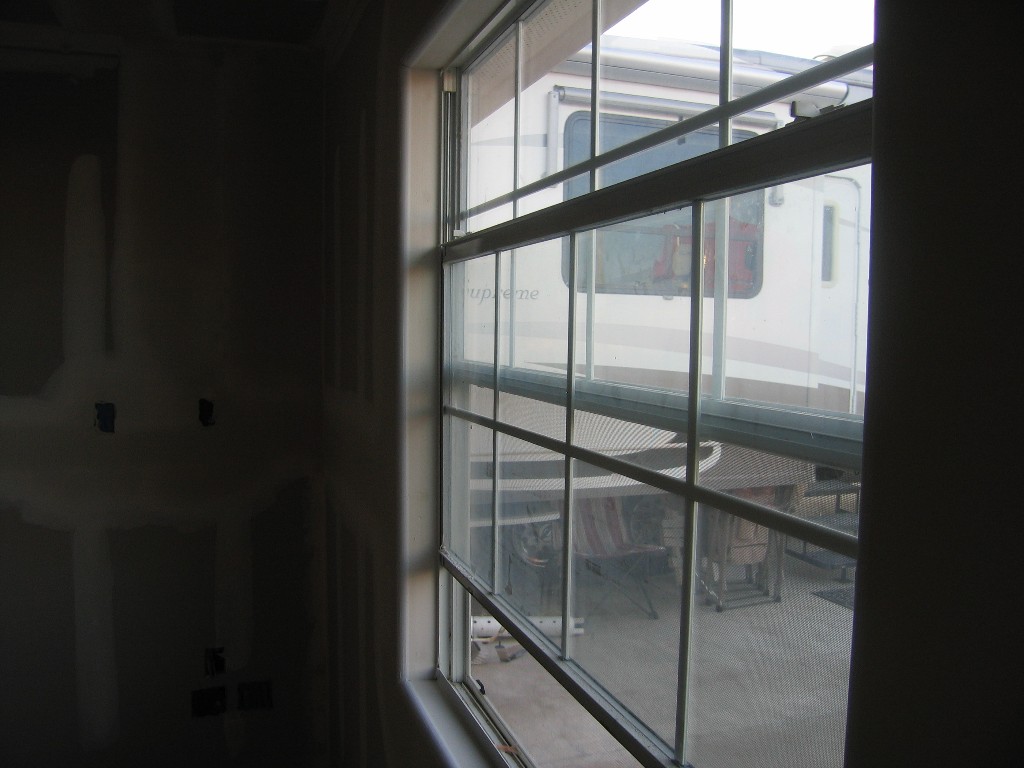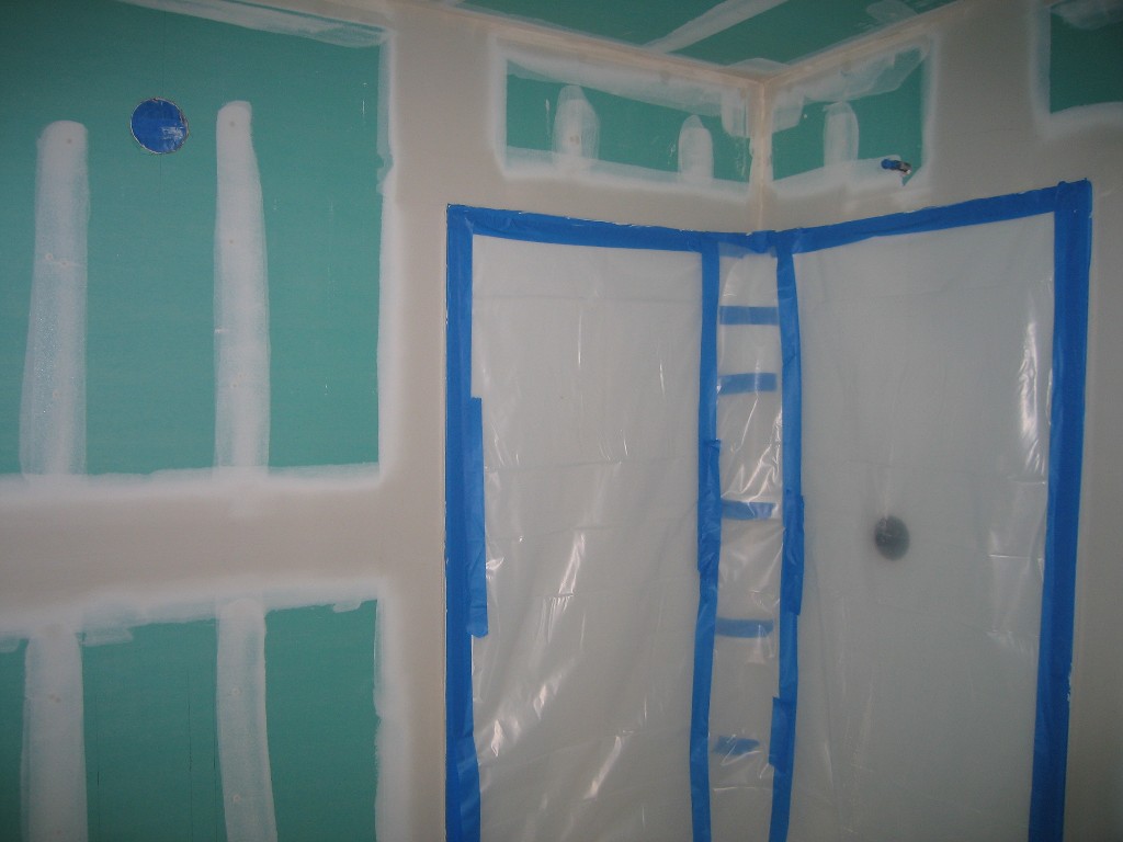 RV Interior We covered the shower walls and base with plastic.  Mark's experience in the building industry says that stuff gets slopped on fixtures if not protected.
