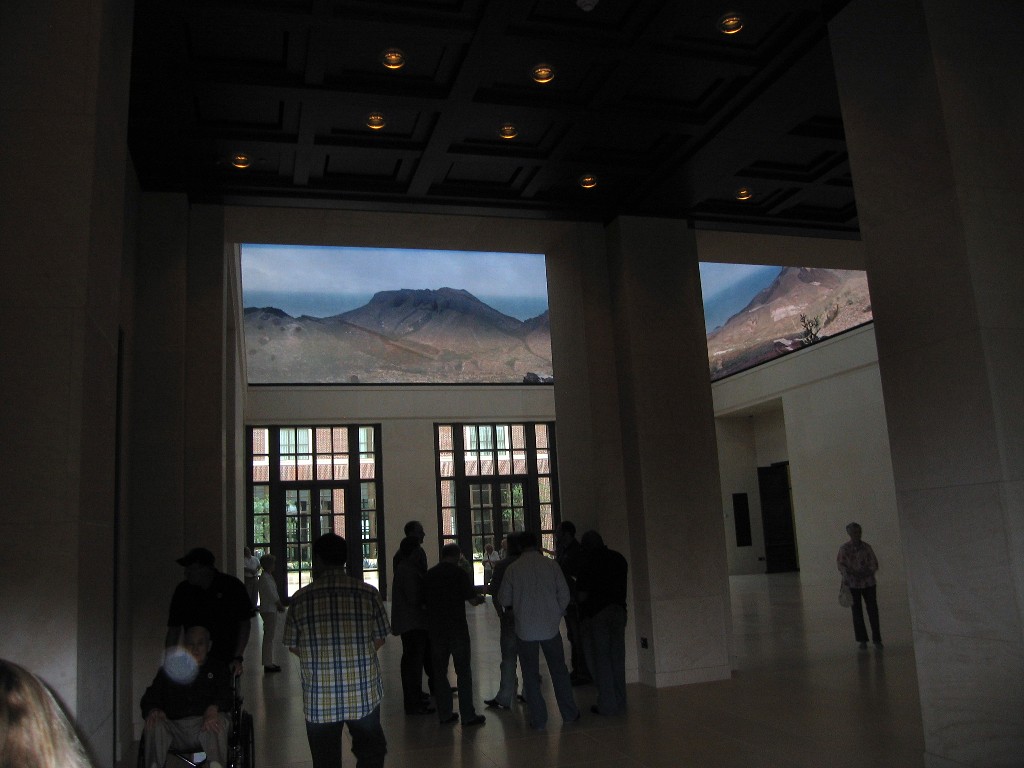 Through the doorway is way appears to be a mural on the upper wall of that gallery. It is really a seamless LCD display on the four walls of the gallery. On a 15 minute schedule, an in-the-round video is played staring in Washington, DC, going through several significant views of America, and ending up in a collage display of photos of people who have entered the Library. | |
